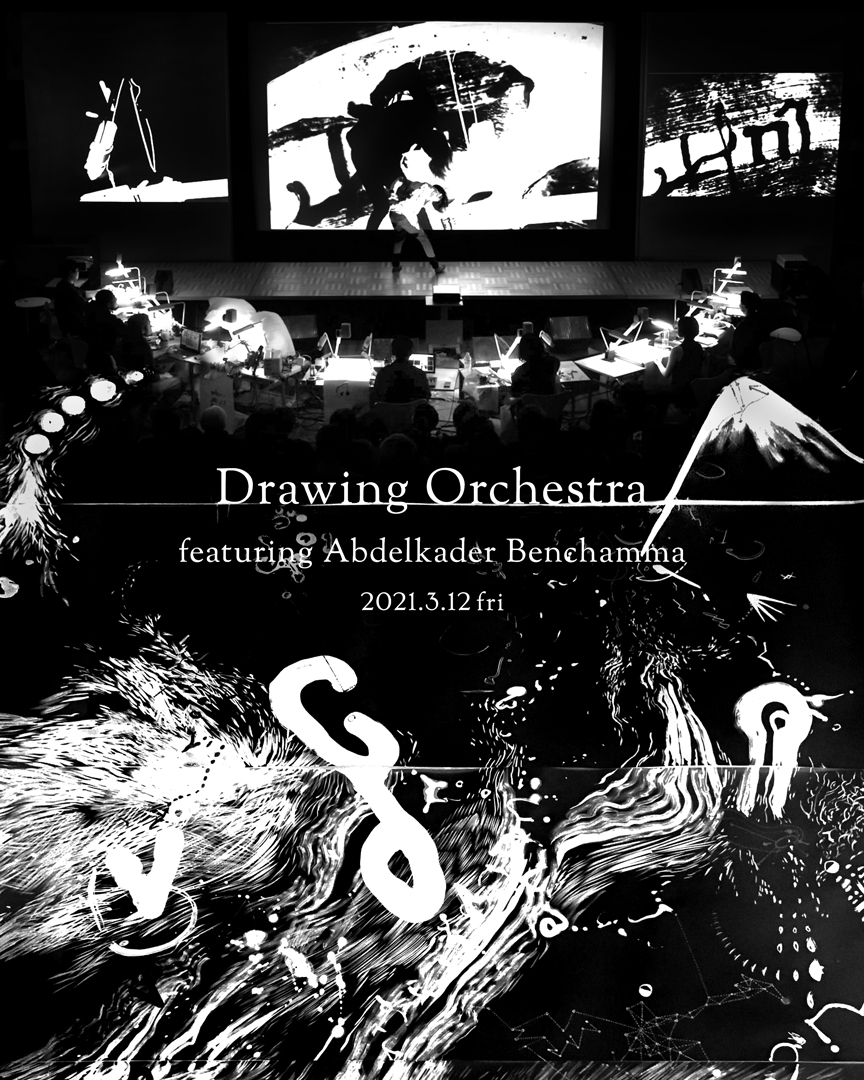 This event is part of the “Drawing Orchestra” art program proposed by artist Hiraku Suzuki and designer Daijiro Ohara. French artist, Abdelkader Benchamma, a major leader of the international contemporary drawing scene, will be invited to the event as a guest, connecting Japan and France in real time. Participating artists include Abdelkader Benchamma, Hiraku Suzuki, and Daijiro Ohara, as well as Sohei Nishino, who explores the relationship between photography and drawing, performer Mineki Murata, digital media conqueror yang02, chirographer Kasetsu, and live painter Akiko Nakayama. This gathering of eight distinct “creators” of differing backgrounds will also bring together their own unique creations, and the juncture of the sights and sounds they create will help them each realize new aspects of their own works. In a world where various forms of divisions are becoming ever more apparent, this event will help transcend the bounds of distance and individuality, and connect its participants together toward a joint work of art. We hope you will enjoy this real-time drawing session as it straddles the boundaries separating Japan and France.