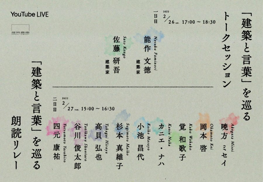 11 poets and architects such as Shuntaro Tanikawa, Wakako Kaku, Fuminori Nosaku will appear at the events