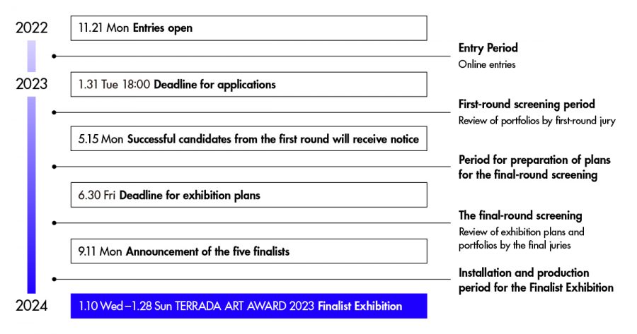 Warehouse TERRADA will be holding TERRADA ART AWARD 2023, recognizing talented creators of contemporary art. The entry period is from November 21st (Mon), 2022, until 6 PM on January 31st (Tue), 2023. The five finalists will be announced on September 11th (Mon), 2023, and TERRADA ART AWARD 2023 Finalist Exhibition will be held in January 2024.
