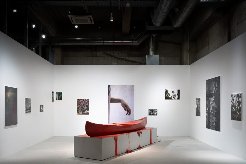 Canoe is the motif Kim has been using for a while. It symbolizes “between” for Kim who’s identity as being between Korean and Japanese. His previous works were real canoes filled with wax, but this time the canoe itself is made of wax, and the plan is for the entire canoe to melt and change its outline. By doing so, the fragility of the canoe becomes even clearer, and the strength of the work is increased. This point was one of the reasons why I had high expectations for his new work. Moreover, the material wax is not only chosen as a material that melts, but also as the material for the 2D works being exhibited together. This integrates the 3D and 2D, and enhances the relationship between the exhibited works. Another reason why I highly praised the composition of Kim’s exhibition. [Meruro Washida / Director of Towada Art Center, Associate professor of Tokyo University of the Arts]