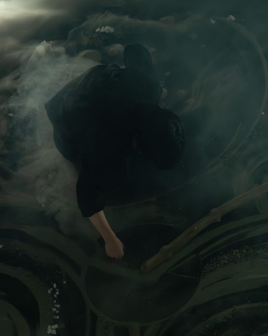The title ”Between everywhere” was inspired by Karesansui, the style of Japanese gardening, which originated from Zen philosophy. The artist perceives his body as “the source of wave energy” and treats stones, sand, and mist as “a medium to visualize the trajectory of energy,” drawing sand patterns on stage.