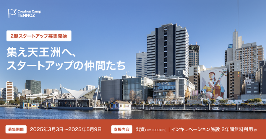 Warehouse TERRADA is opening applications for the second year of “Creation Camp TENNOZ,” an incubation program designed to support the growth of startups in the seed phase. The application period will run from March 3rd (Mon) to May 9th (Fri), 2025. After the first and second rounds of selection and a final pitch presentation, the second-year startups will be chosen in July 2025. Each selected startup, up to a maximum of ten, will receive 10 million yen, two years of free facility use, and various forms of support to assist with business commercialization.