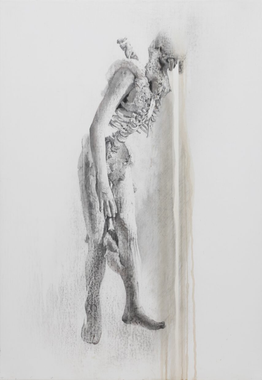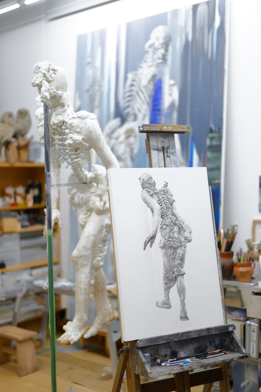 This exhibition’s highlight, At the Shore, is the culmination of the artist’s exploration of still-life painting in his home studio while caring for his family during the pandemic, when he refrained from inviting any models. Suwa says that he “lost the passion to paint people” after the pandemic. This large painting depicts a human-like figure, a bricolage made of found objects from his studio, such as old skeletal specimens, plaster, and exterior wall filler. The bricolaged human-like figure and rough sketches documenting the creative process will also be on display.
