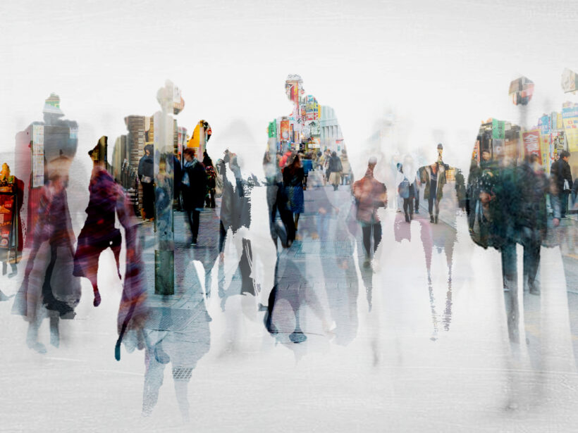 People move between the buildings like waves.