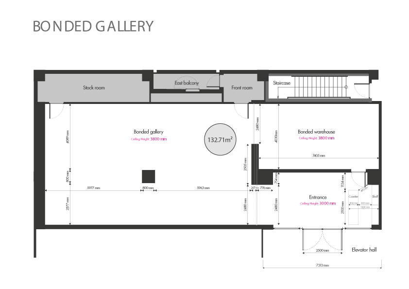 Gallery space (132.71 m²), warehouse (12.38 m²)