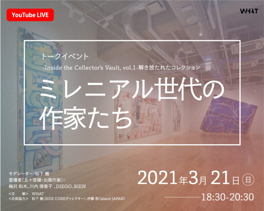 寺⽥倉庫株式会社(東京都品川区 代表取締役社長:寺田航平)が運営する現代アートのコレクターズミュージアムWHAT」は、企画展 「-Inside the Collector’s Vault, vol.1-解き放たれたコレクション」 関連トークイベントとして、「ミレニアル世代の作家たち」を2021年3月21日(日)18時30分よりWHAT公式YouTubeにて生配信いたします。