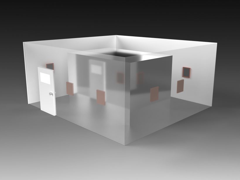 マジックミラーの構造は、こちらから見えていない時は向こう側からは見えているということである。今回展示する部屋の構造物の中にあるモニタリングカメラでは、構造物の外側にいる鑑賞者の様子も映っている筈だが、鑑賞者がモニターを見ることのできるタイミングでは、鑑賞者を映すことはない。この作品では、照明のプログラミングによって見える対象が強制的に移り変わることで、見ること・見えることという概念への揺さぶりを行う。