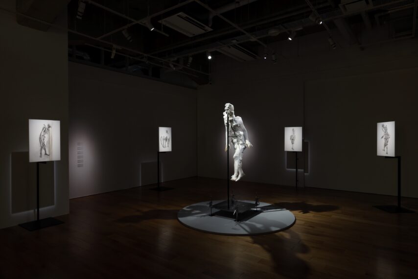 諏訪は、美術史や技法・材料の研究にとどまらず、歴史学、民俗学、臨床医学など多様な分野を作品に取り入れてきました。徹底した取材を通して、亡くなった人物や不可視の存在を描く、リサーチプロジェクト型の絵画制作が高く評価されています。しかし、コロナ禍で取材が難しくなり、また母の介護をする日々を送るなかで、「人間を描きたいという気持ちを徐々に失っていった」と語ります。こうした日々を経て制作されたのが、最新の大型絵画「汀にて」です。アトリエに眠っていた古い骨格標本、プラスター、外壁充填材などを組み合わせて人型(ひとがた)をブリコラージュし、その姿を描いた本作は、人体の逆再生ともいえるプロセスを通して、作家が生と死の汀を見つめた経験を物語るようです。