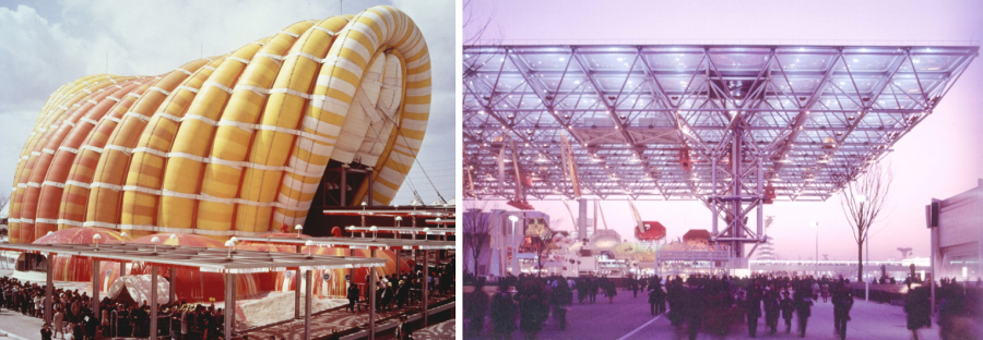 左) 川口衞 富士グループ・パビリオン©︎川口衞構造設計事務所 右) 坪井善勝・ 川口衞 お祭り広場©︎神谷宏治