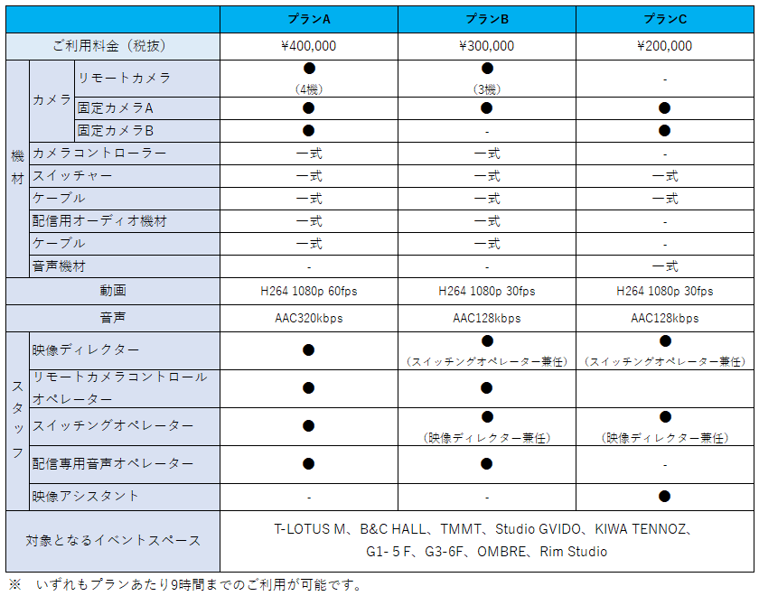 企業やアーティストによる情報発信の主戦場がライブ配信に移行する一方で、イベント主催者は、ライブ配信導入時の機材選定、技術の習得、管理、運用の負荷等の課題に直面しています。当社はこの課題を解決し、安定したライブ配信を可能とするため、配信機材に加え、機材操作のエンジニアまでを含むパッケージプランを、天王洲の当社イベントスペース全てにおいて提供いたします。