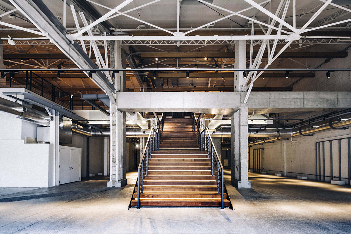 中央に配した大階段が印象的で、コンクリートの無機質さと技巧的な木の温もり、相対する面を併せ持つ内観が特徴的です。