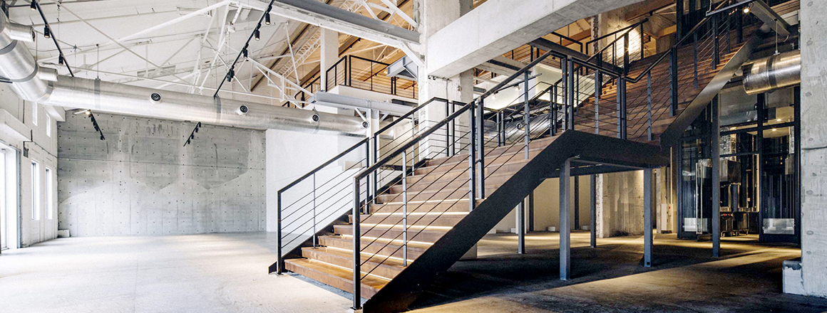 中央に配した大階段が印象的で、コンクリートの無機質さと技巧的な木の温もり、相対する面を併せ持つ内観が特徴的です。
